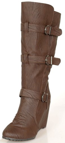 These wedge boots are a cold weather staple style. Features a knee-high design with tripe strap adjustable metal buckles. Wedge heel. Zipper closure on the side. Heel: 3.5"(0.25" platform) Total Height: 15" Circumference: 15.5" Color: BrownCondition: New: In Original BoxSKU: Randi-87 Light Brown 7 Suggested Retail Price: $90.00 wo7zz Code: Randi-87 Light Brown