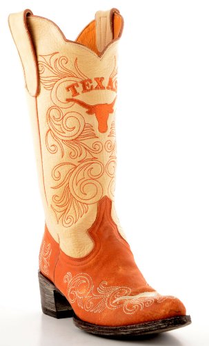 Gameday Boots has created a line of custom college boots for students, alumni, and die-hard fans who want to show off their school pride in western style! Officially licensed Gameday college boots are quality handcrafted, distinctive western boots - with school pride! These University of Texas cowboy boots feature an ornage distressed leather foot under a bone 13" leather shaft. Official University of Texas Longhorns embroidered school logo accents. Single stitched welt. Fashionable 2" cowboy boot heel with rubber grip surface. - Style UT-L072-1- Officially licensed University of Texas cowboy