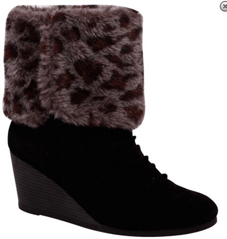 This fantastic wedge ankle bootie has a soft faux fur cuff with leopard anima print design. Round toe front,, slip on style, smooth lining and finished with cushioned insole. Heel: 2.5" Total Height: 9"(Including Heel) Circumference: 12" New: In Original BoxSKU: Maida-01 Black 6 wo6zz RIDER-STYLES Color: BlackCode: Maida-01 Black